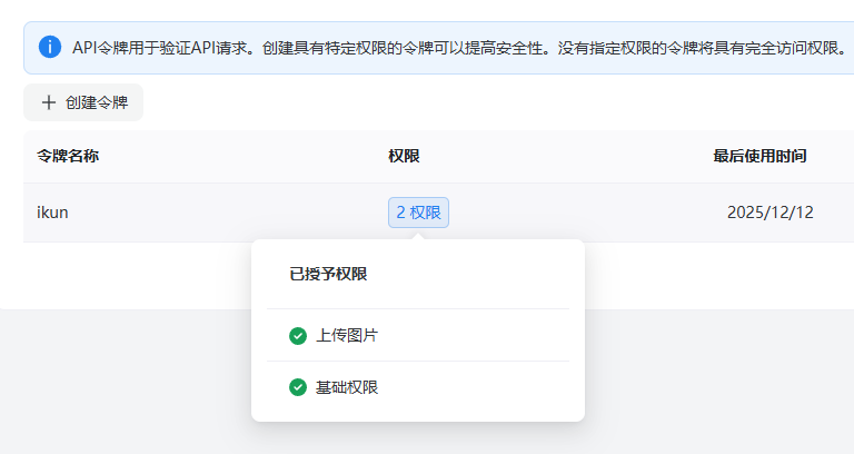 其次,左侧导航栏中点击我的令牌,创建令牌,给予权限上传图片和基础权限,完整后复制token值并打开后台插件管理页面 ;