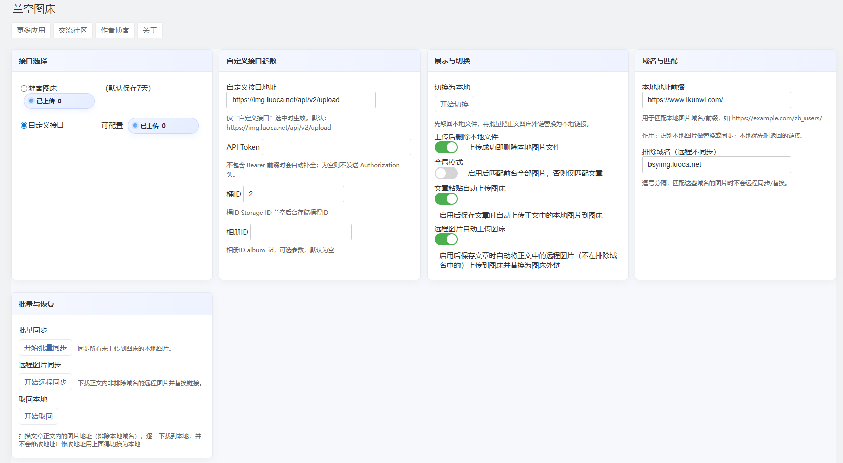 自动上传图片到兰空图床,使用图床外链,支持自定义兰空图床api,支持远程图片同步,支持图床图片取回本地。